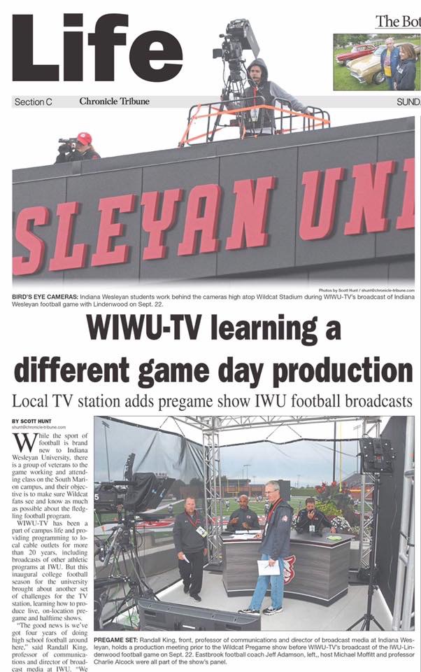 The aspect of the tv station that not everyone sees is how it connects the university with the community. It also allows the students (some who don’t even live in Indiana) to personally connect with the community. I have learned so much about Grant County from being a media communication major, which has now been altered because of these cuts. I now have a genuine love for Marion, because of WIWU-TV. Even while being on the roof of the football stadium (which look at me making it into the newspaper) I was able to connect with all kinds of people. When you work for the station, you meet all levels of IWU employees and students that you most likely wouldn’t have met without the station. You also get to meet all ranges of members of Grant County.